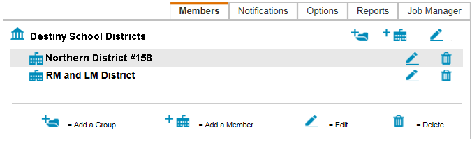 Getting started as a Super Administrator - ConsortiumA Destiny® consortium installation allows you to install and manage multiple Destiny members, which can be either districts or individual sites, from a single point. Each member of a consortium is completely autonomous; for example, one district cannot interact with another district. The only point of contact between members is through the Super Administrator. Within a member (or district), however, the sites share materials records and patron records and can exploit the inter-site functionalities, such as borrowing or transferring materials, and transferring patrons. In addition, the member administration can generate high-level reports for the member. This topic guides you through performing the initial tasks for your consortium installation: setting up, editing, and organizing your installation. Set up your installationAfter logging in, click Setup in the upper corner. You will see the Members tab of Update Destiny Installation, as well as tabs for the other administrative areas: Notifications, Options, Reports, and Job Manager. The Members tab contains the options you will need to configure your installation.