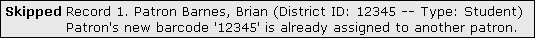 Tip: Use your browser's File > Save As to save the Update Patrons job summary to your computer. Open the file in a separate instance of your browser. Toggle between the Update Patron Job Summary report and Back Office > Manage Patrons. Copy and paste between windows to speed data entry. To update the District ID in the record being skipped: